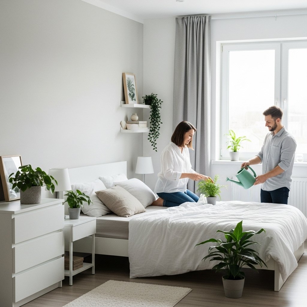 Small plants bring life and freshness to a couple’s bedroom without making the décor complicated. Choose low-maintenance options like snake plants, pothos, or small succulents. Place them on nightstands, windowsills, or corners to add a natural touch. The green color adds calmness and makes the room feel alive. Simple greenery helps create a beautiful and refreshing atmosphere.
