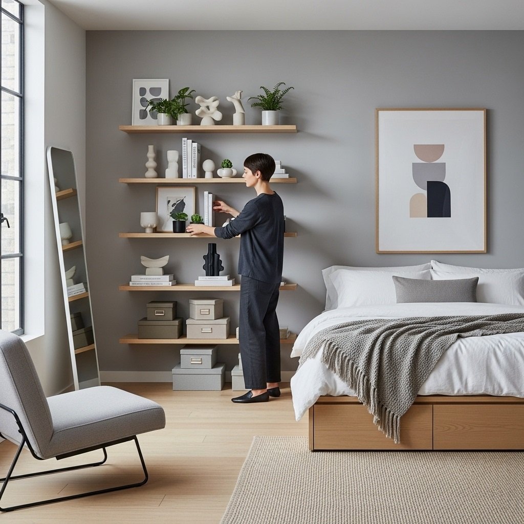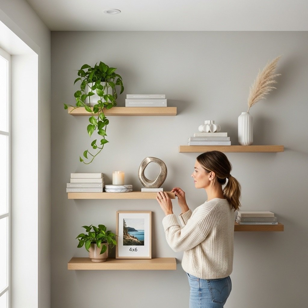 Shelves are both decorative and functional, making them perfect for showcasing your favorite items. Use them to display books, small plants, candles, or aesthetic décor pieces. Floating shelves keep walls interesting without taking up floor space. To achieve a balanced look, mix different heights, colors, and textures in your display. This idea works well in bedrooms, small rooms, or living spaces.