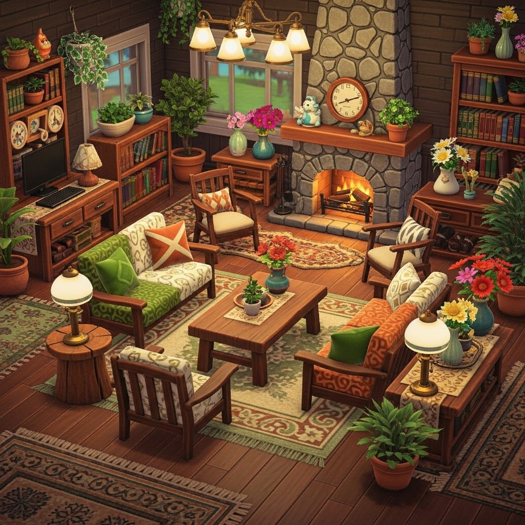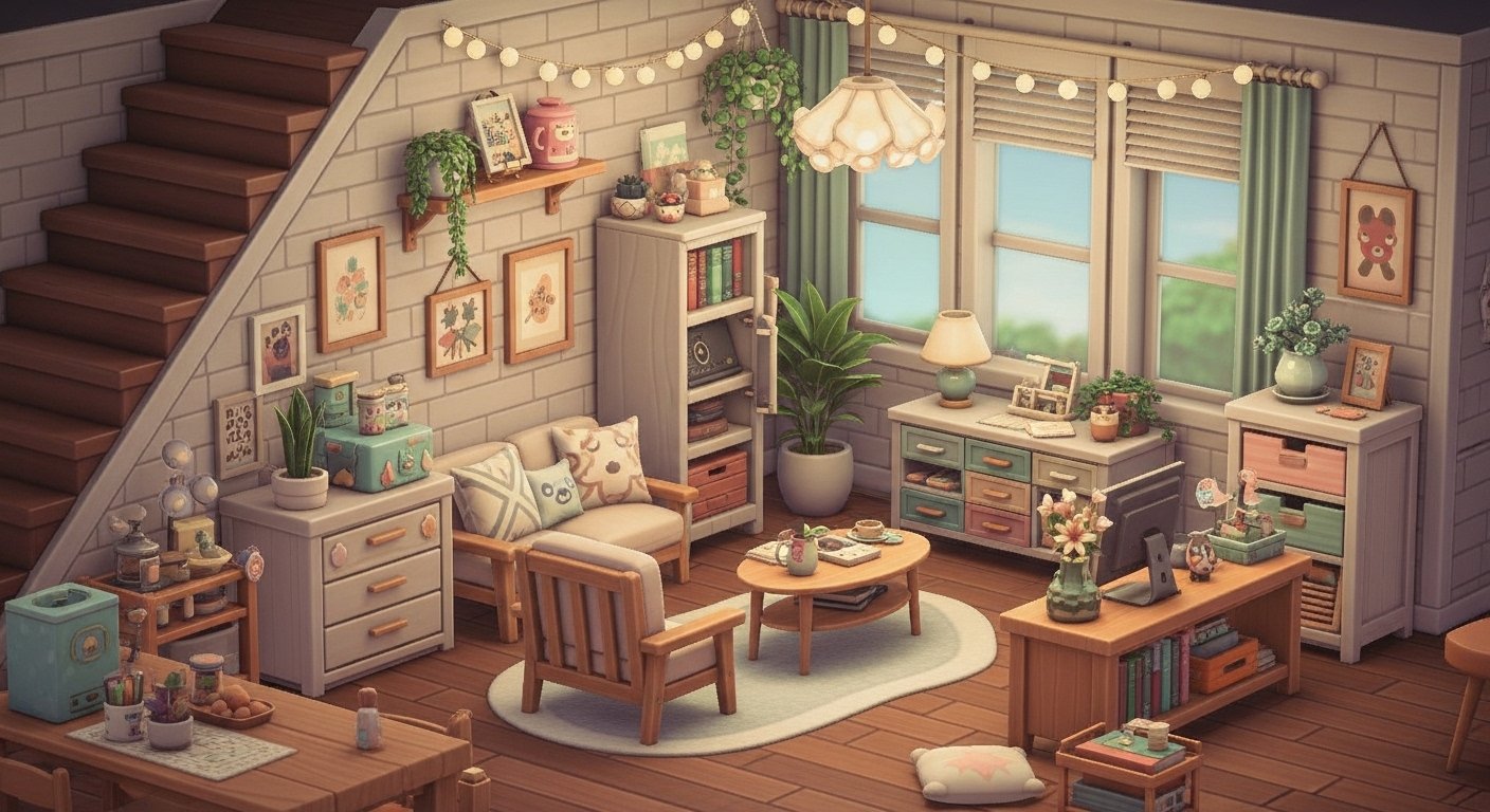 A cottagecore living room is one of the most popular ACNH home interior styles due to its warm and natural aesthetic. This design focuses on wooden furniture, soft lighting, and earthy tones like beige, brown, and green. Adding items such as a fireplace, bookshelves, and vintage sofas helps create a peaceful countryside vibe. Plants and flowers are also essential to enhance the natural atmosphere of the room. This setup is perfect for players who want a calm and cozy living space in their ACNH home.