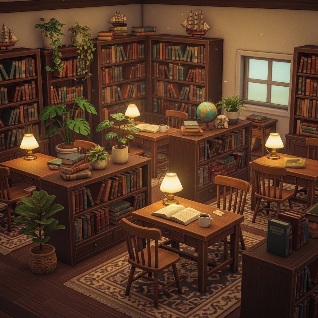 A library reading room creates a quiet and intellectual space inside your ACNH home. Fill the room with bookshelves, study desks, and comfortable chairs. Warm lighting is essential to make the space feel cozy and inviting. Adding small decorative items like globes and plants enhances the scholarly atmosphere. This interior idea is perfect for players who love reading and peaceful environments.