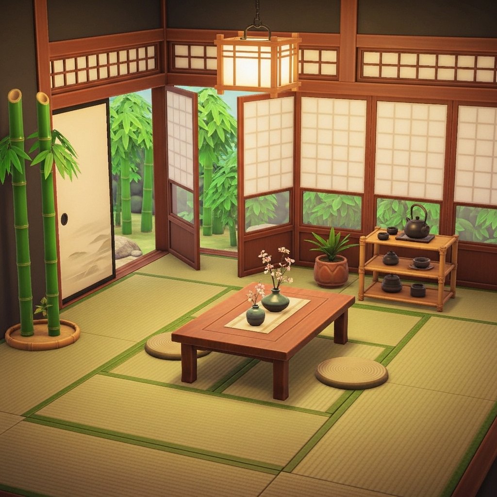 A Japanese-inspired tatami room brings a peaceful and traditional aesthetic to your ACNH home interior. This design uses tatami mats, low tables, and sliding screens to create an authentic atmosphere. Soft lighting and minimal decorations help maintain the calming Zen vibe. Adding items like tea sets or bamboo decorations enhances cultural authenticity. This room style is perfect for relaxation and meditation within the game.