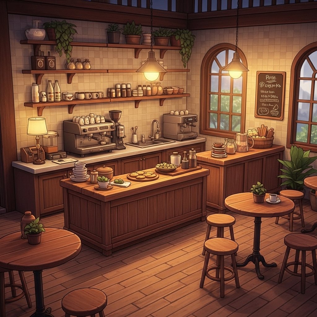 An indoor café kitchen transforms your ACNH home into a cozy coffee shop environment. Wooden counters, coffee machines, and display shelves are essential elements of this design. Warm lighting and rustic decorations help create a welcoming café vibe. You can also add stools and small tables to complete the seating area. This interior idea is perfect for roleplaying and socializing within the game.