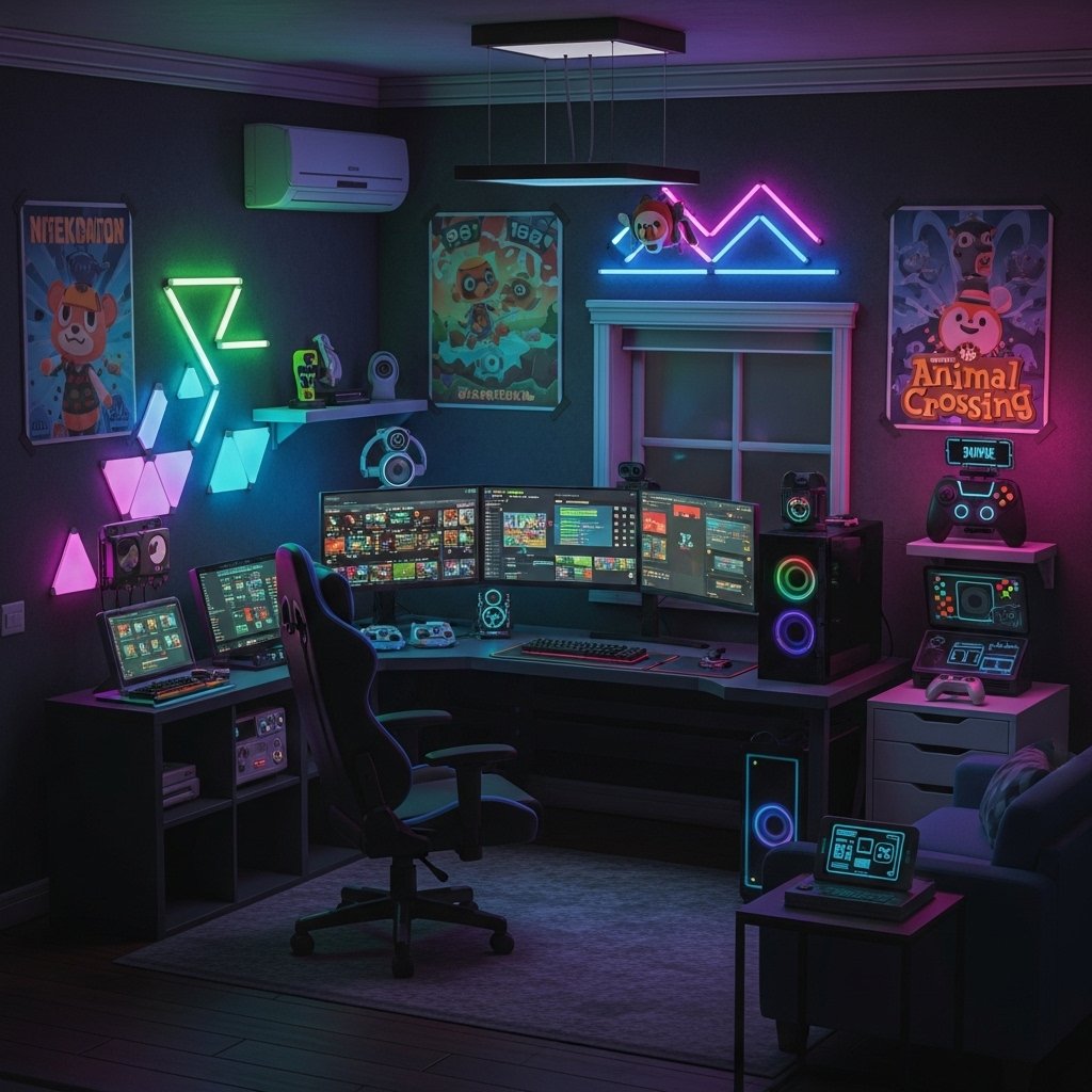 A gamer room setup is a modern and fun interior idea for ACNH players. Use items like gaming chairs, multiple screens, and tech-inspired furniture to create a digital workspace. Dark colors combined with neon lighting enhance the gaming atmosphere. Posters and collectibles add personality to the room. This design is perfect for players who want a modern entertainment space inside their virtual home.