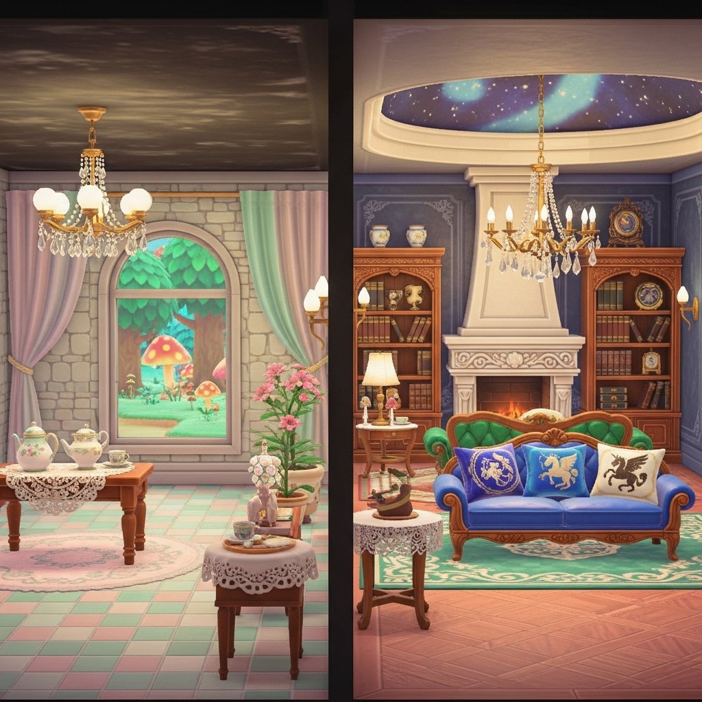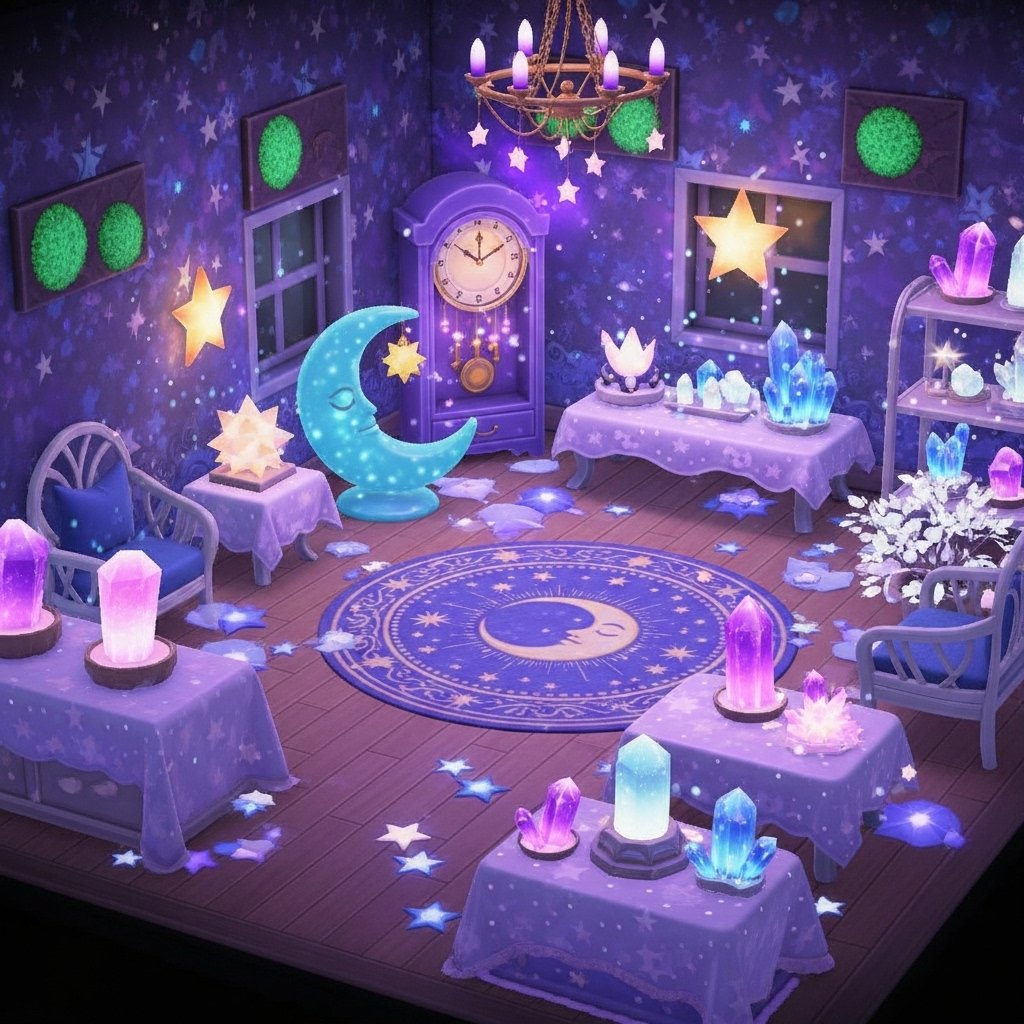 A fantasy magic-themed room brings a mystical and imaginative vibe to your ACNH home. Use glowing furniture, star fragments, and magical items to create a dreamy atmosphere. Purple, blue, and dark tones work best for this aesthetic. Adding wands, crystals, and enchanted objects enhances the magical feel. This design is ideal for players who enjoy creative storytelling and fantasy roleplay.