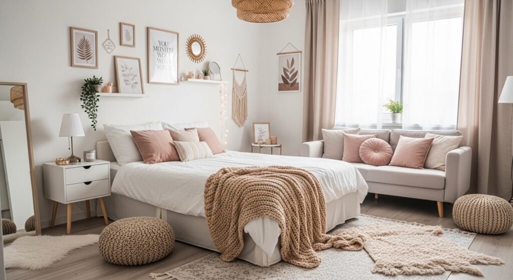 Wall decor is another easy way to enhance the aesthetic feel. Minimal wall art, framed quotes, mirrors, or floating shelves can add personality to plain walls. You don’t need too many items — just a few well-placed pieces can create a beautiful focal point. Soft lighting like table lamps or warm fairy lights can complete the look.