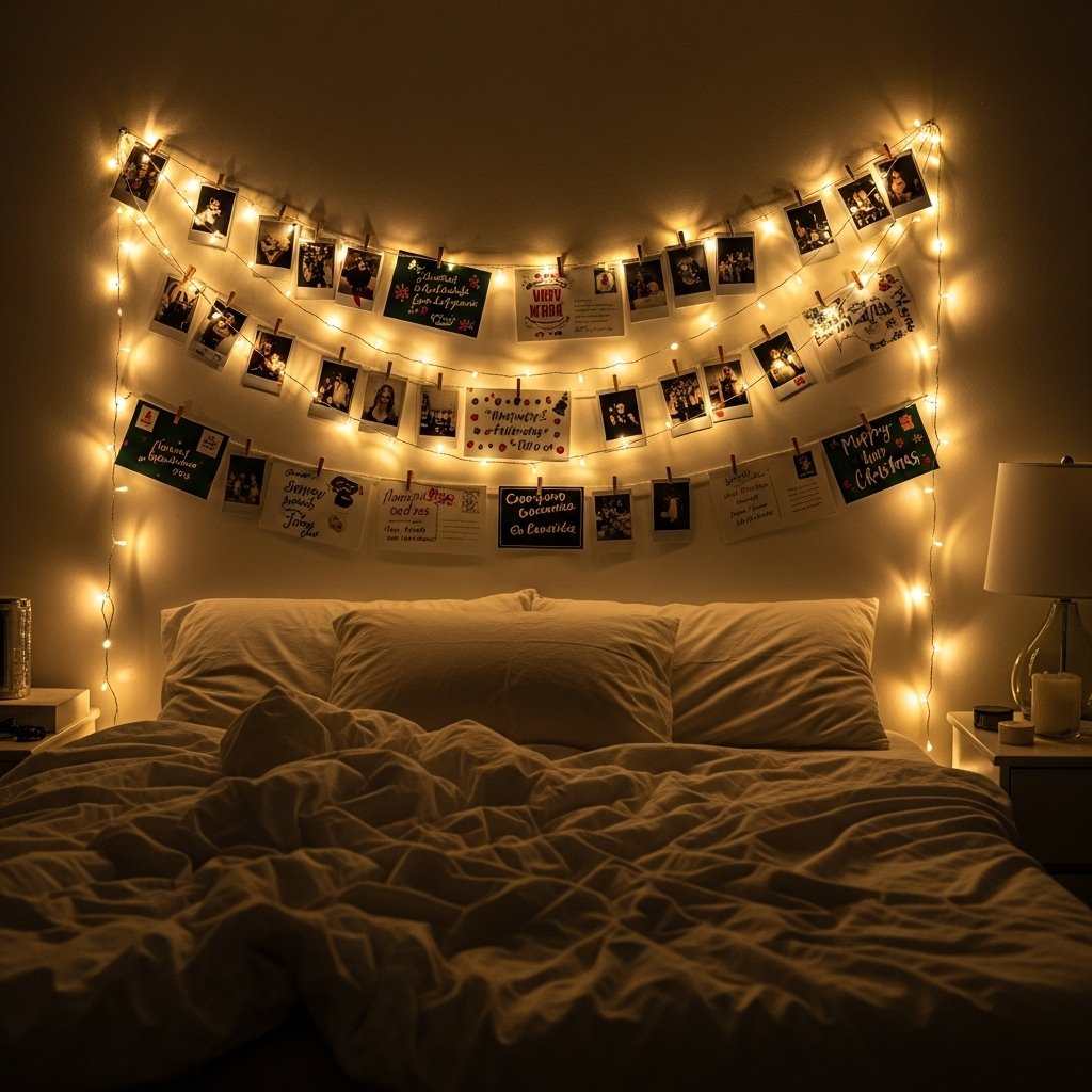 Fairy lights are a must-have for aesthetic Christmas room decor DIY projects. You can drape warm white string lights along walls, headboards, or windows to create a soft, dreamy glow. Adding clips to the lights allows you to hang Christmas photos, polaroids, or postcards for a personal touch. This decor idea works beautifully in bedrooms, dorm rooms, and small spaces. The gentle lighting instantly makes your room feel cozy and festive without overwhelming the space.