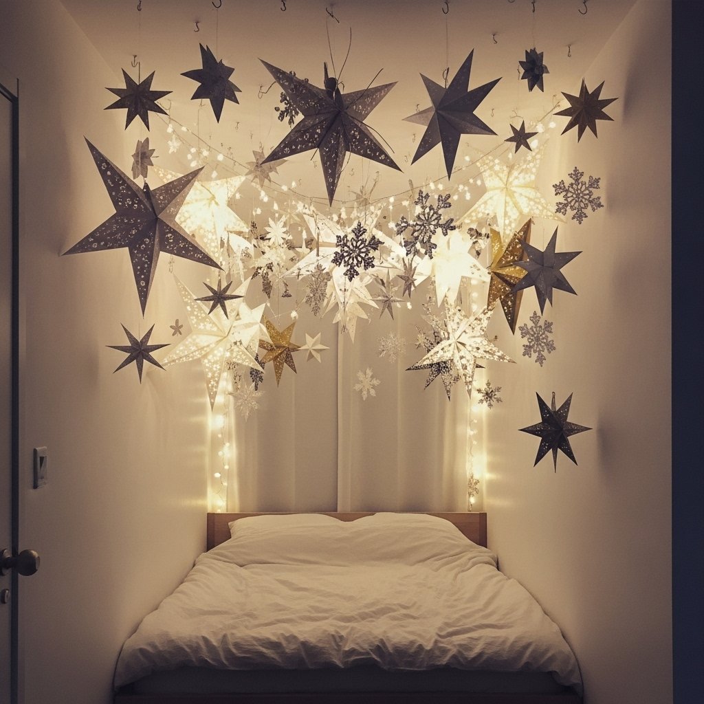 Ceiling decor is often overlooked but can dramatically elevate your Christmas room aesthetic. Hanging paper stars, snowflakes, or lightweight ornaments adds depth to your space. Use clear thread or fishing line to create a floating effect. Keeping designs minimal ensures the room doesn’t feel crowded. This decor idea works especially well in small rooms and dorms.