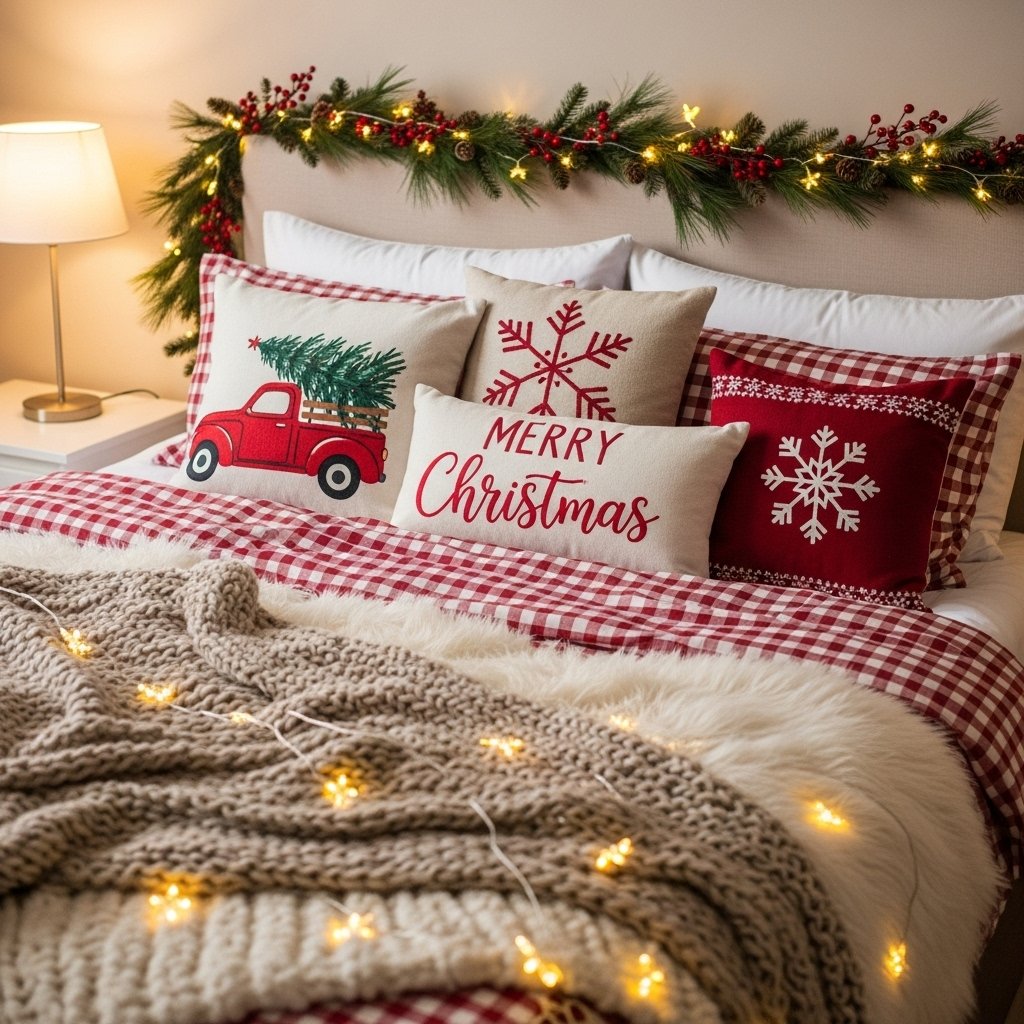 Your bed is a major focal point, making it ideal for Christmas DIY decor. Adding festive pillow covers, knit blankets, or red-and-white throws instantly transforms the space. You can also create a DIY Christmas pillow using fabric paint or iron-on designs. Layering textures like faux fur and knit materials boosts the cozy aesthetic. This decor idea makes your room feel warm and inviting throughout the holiday season.