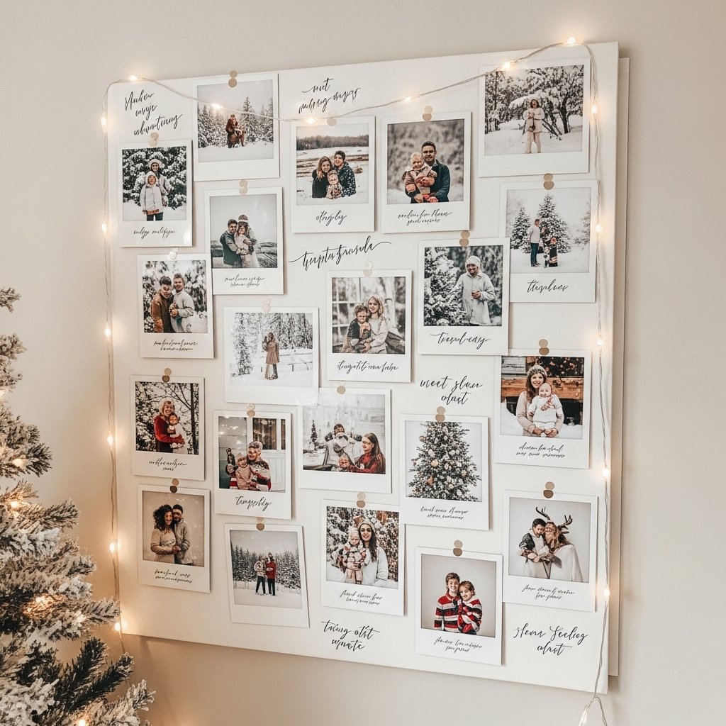 A Christmas photo wall collage is a personal and aesthetic DIY decor idea. Print your favorite winter memories, holiday quotes, and seasonal images in neutral tones. Arrange them in a grid or scattered layout for a Pinterest-inspired look. Adding fairy lights or washi tape enhances the festive aesthetic. This decor idea combines memories and creativity, making your room feel extra special.