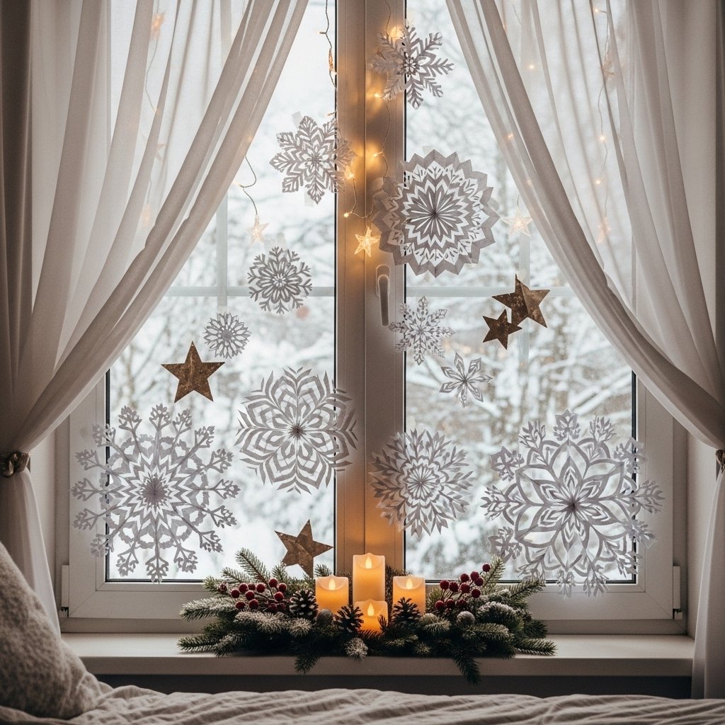 DIY window decor brings Christmas vibes into your room even during the daytime. You can hang paper snowflakes, star cutouts, or sheer curtains with fairy lights. Using white or transparent materials keeps the decor light and aesthetic. Window decorations also look beautiful from both inside and outside the room. This idea adds festive charm without cluttering your space.