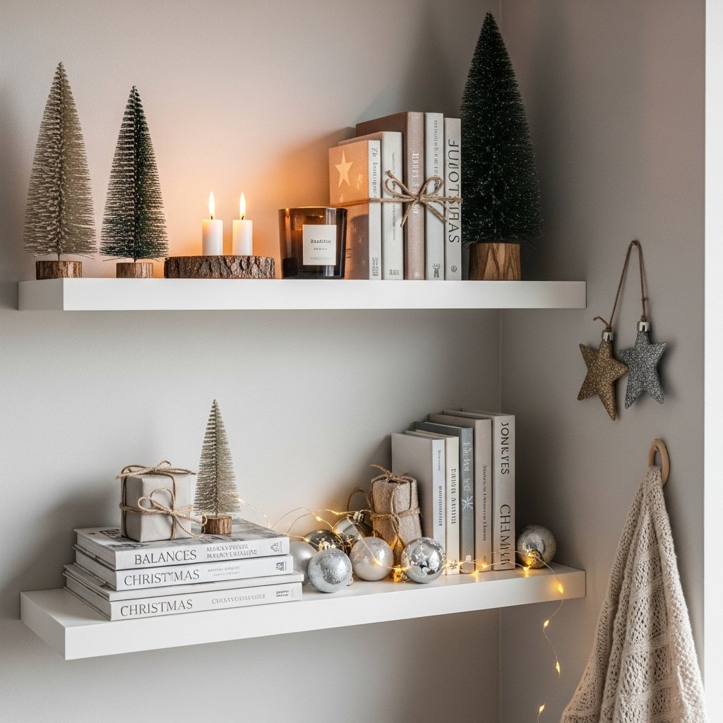 Christmas shelf decor DIY projects help you style small spaces beautifully. You can decorate shelves with mini trees, candles, books wrapped in festive paper, and tiny ornaments. Keeping a consistent color palette maintains an aesthetic look. Mixing decor heights adds visual interest and balance. This idea is perfect for bedrooms, study corners, and living spaces.