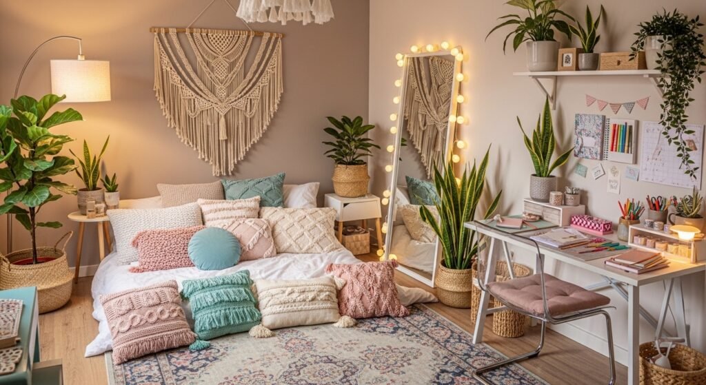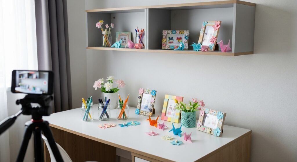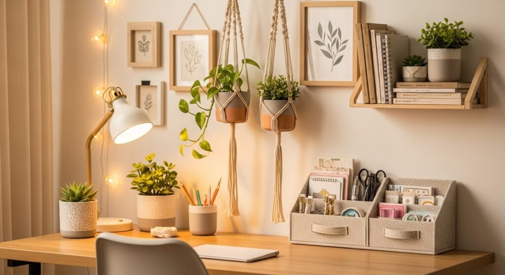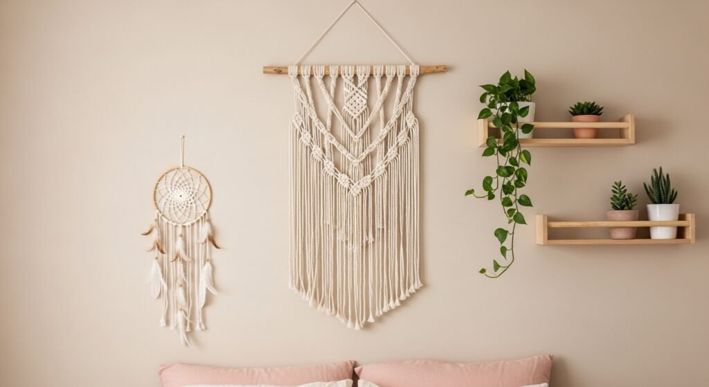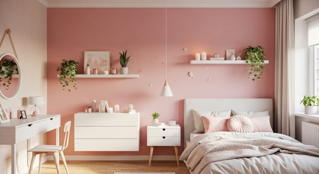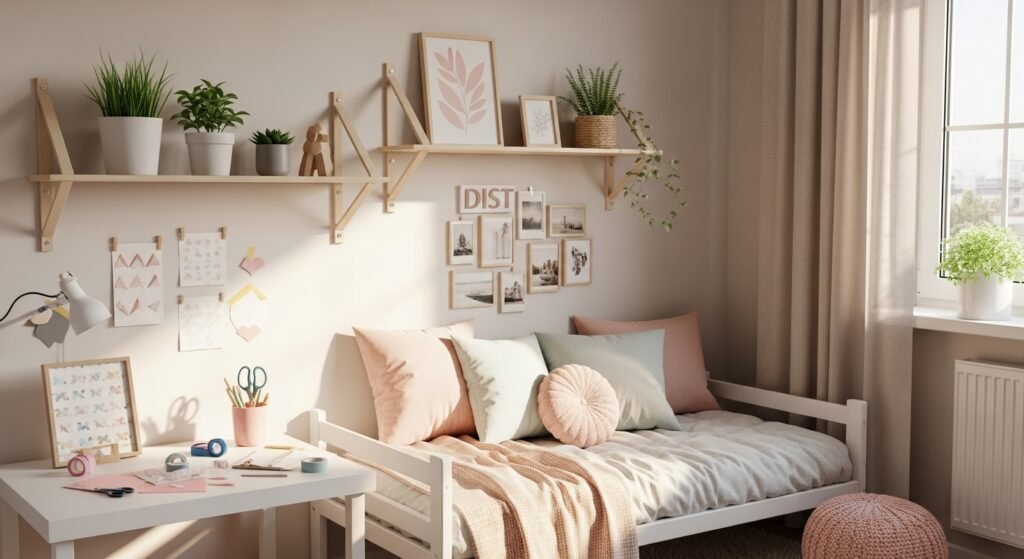 Wall shelves are another beautiful and practical option. Floating shelves can hold candles, small plants, books, or decorative objects. They not only add style but also give you extra storage space. Keeping the arrangement neat and minimal helps maintain that soft, aesthetic vibe.