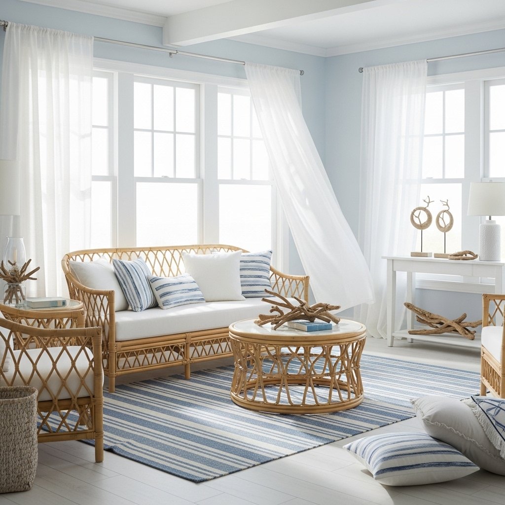 Coastal-inspired American home interior design brings the freshness of the ocean into your living space. It features light colors such as white, soft blue, and sandy beige. Natural materials like rattan, jute, and driftwood are commonly used for furniture and décor. Large windows and sheer curtains help maximize natural light. This style creates a relaxing and vacation-like atmosphere inside the home.