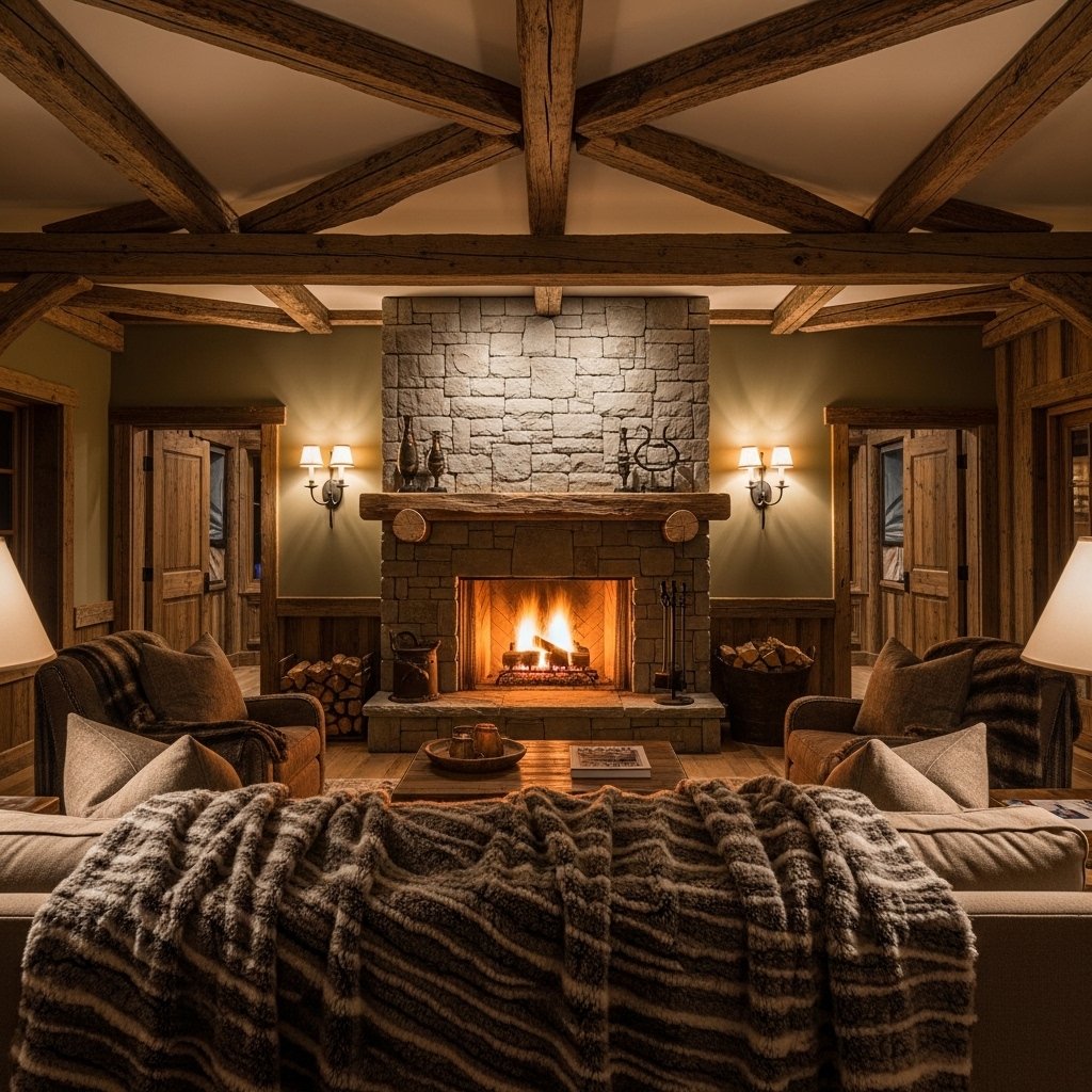 Rustic cabin-style interiors are deeply rooted in natural elements and cozy aesthetics. This American home interior style uses wood, stone, and earthy tones throughout the space. Large fireplaces often serve as the centerpiece of the living room. Soft lighting and warm textures make the home feel inviting and comfortable. It is an ideal style for countryside homes or mountain retreats.