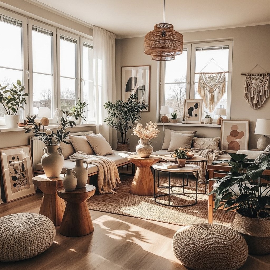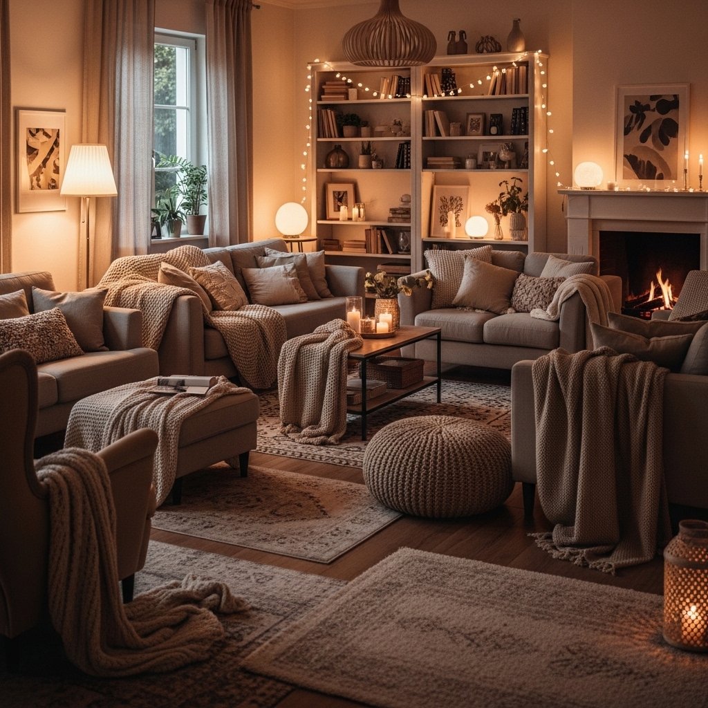 The cozy warm aesthetic focuses on comfort and relaxation through soft textures and warm tones. Earthy colors like beige, brown, and soft orange create a welcoming vibe. Layered rugs, cushions, and blankets make the space feel lived-in and comfortable. Warm lighting such as table lamps and fairy lights adds to the cozy atmosphere. This style is ideal for people who want their apartment to feel like a peaceful retreat.