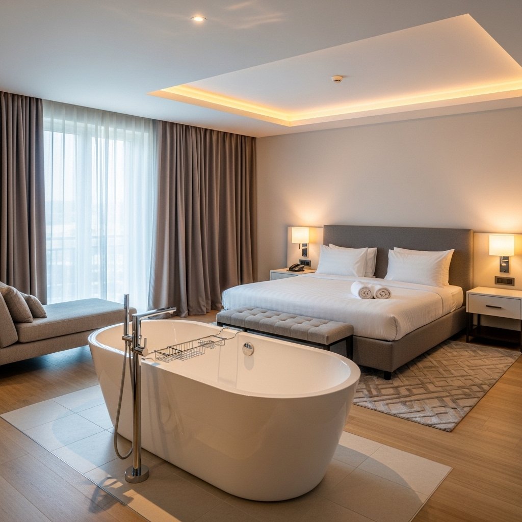 An open concept bathroom interior with bathtub blends the bathroom with the bedroom area. The bathtub is often placed in a visible and stylish corner of the room. This layout creates a luxurious hotel-suite feeling at home. Curtains or partial dividers may be used for privacy when needed. It is ideal for modern, high-end interior designs.