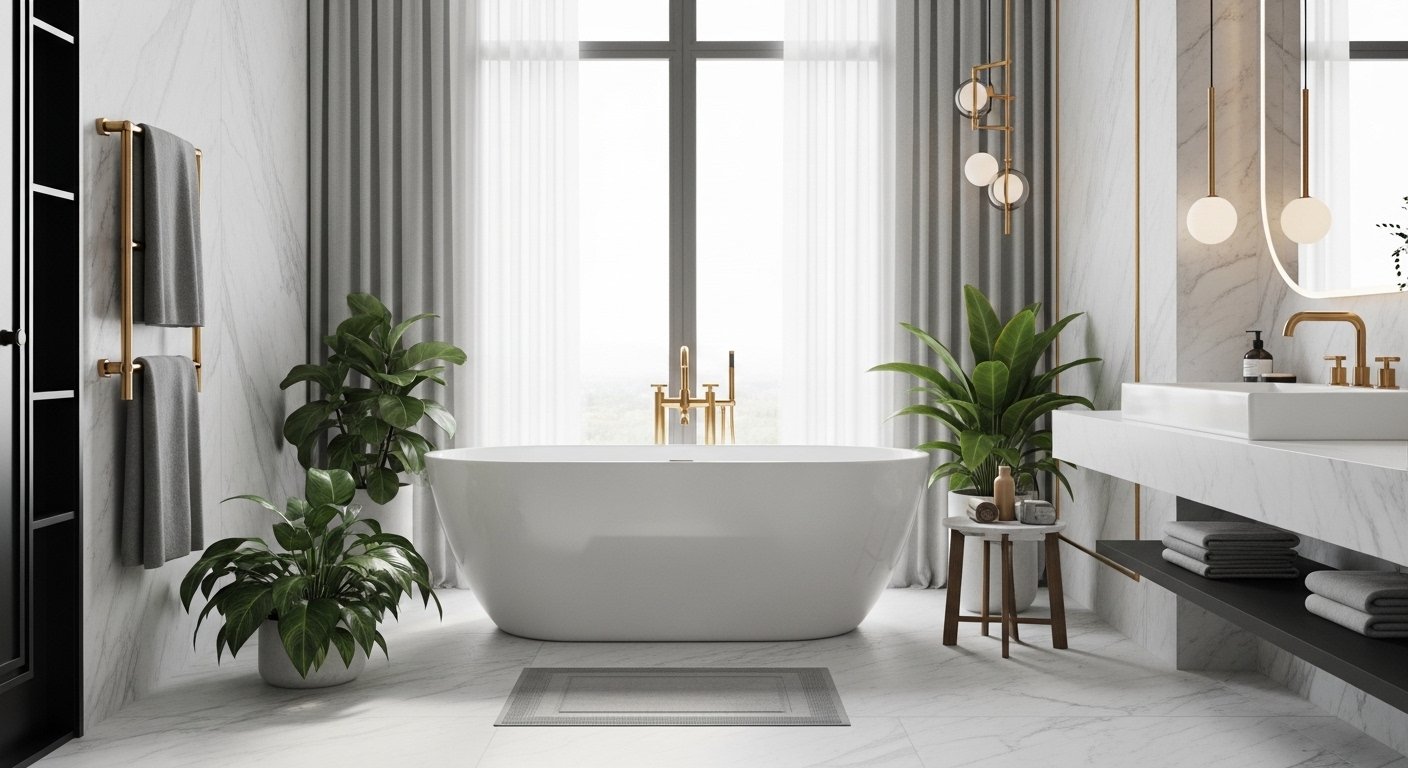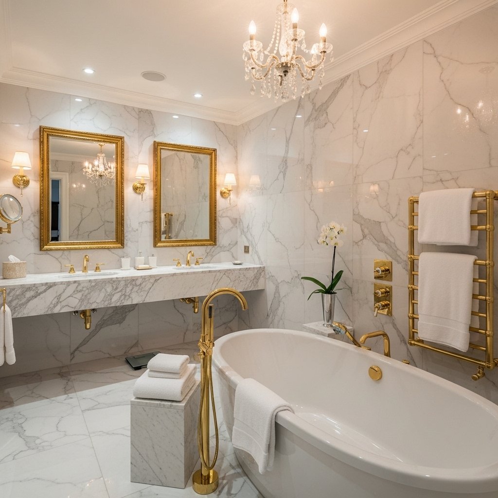 A marble bathroom interior with bathtub represents luxury and timeless elegance. Marble walls and flooring create a sophisticated and high-end appearance. A white or stone bathtub blends beautifully with the overall design. Gold or brass fixtures add a touch of glamour and richness. This style is perfect for creating a premium hotel-like bathroom experience at home.