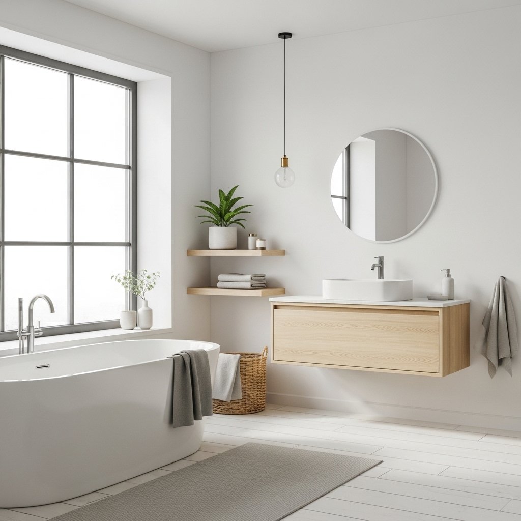 A Scandinavian bathroom interior with bathtub focuses on simplicity, functionality, and natural light. Light wood finishes and white tones dominate the space for a fresh and airy feel. The bathtub is usually designed in a simple, modern shape. Minimal décor and natural textures enhance the calm environment. This design is perfect for those who love cozy yet modern interiors.