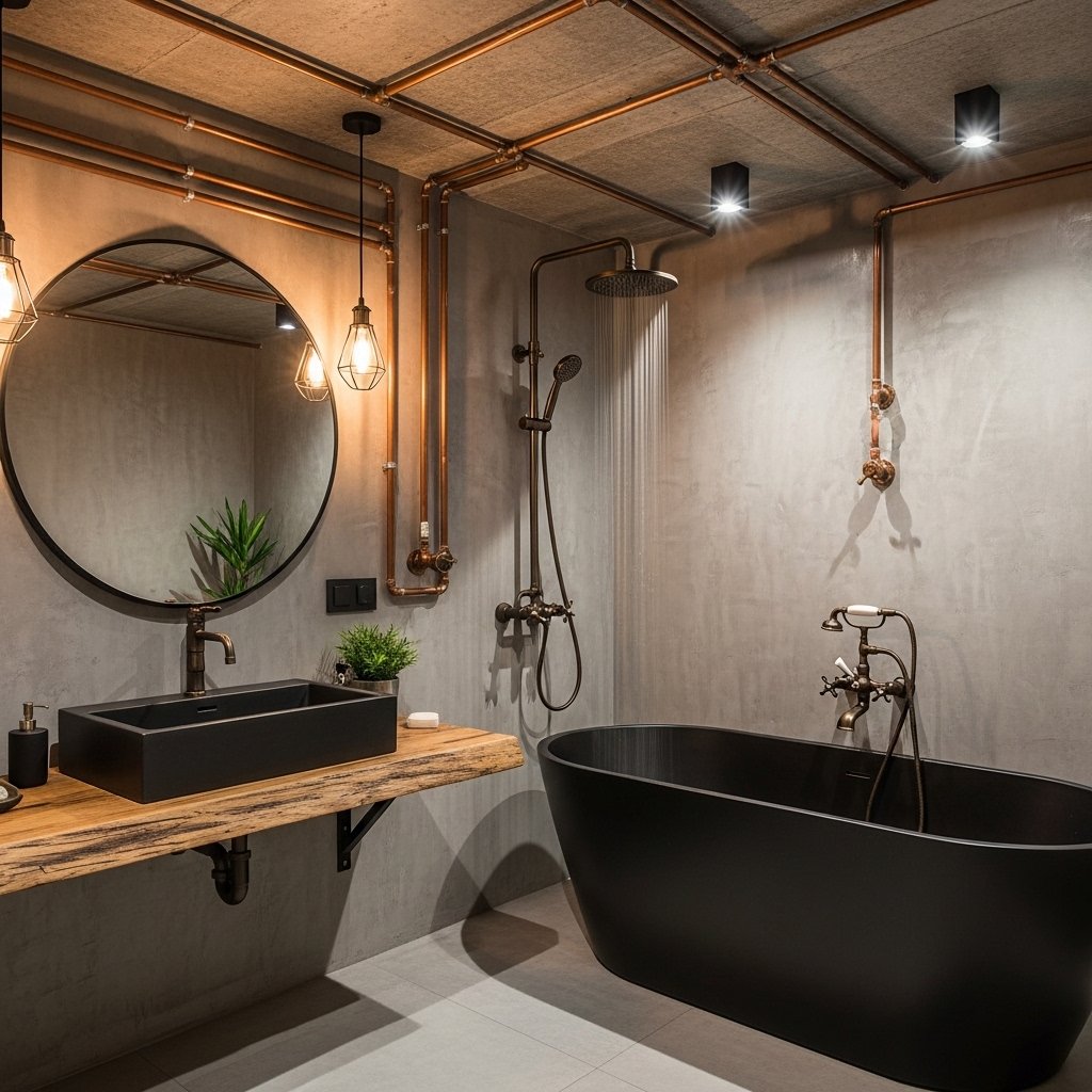 An industrial bathroom interior with bathtub features raw and edgy design elements. Exposed pipes, concrete walls, and dark metal finishes create a bold look. A matte black or stone bathtub fits perfectly into this aesthetic. Warm lighting balances the rugged materials and adds comfort. This design is ideal for modern loft-style homes or urban apartments.