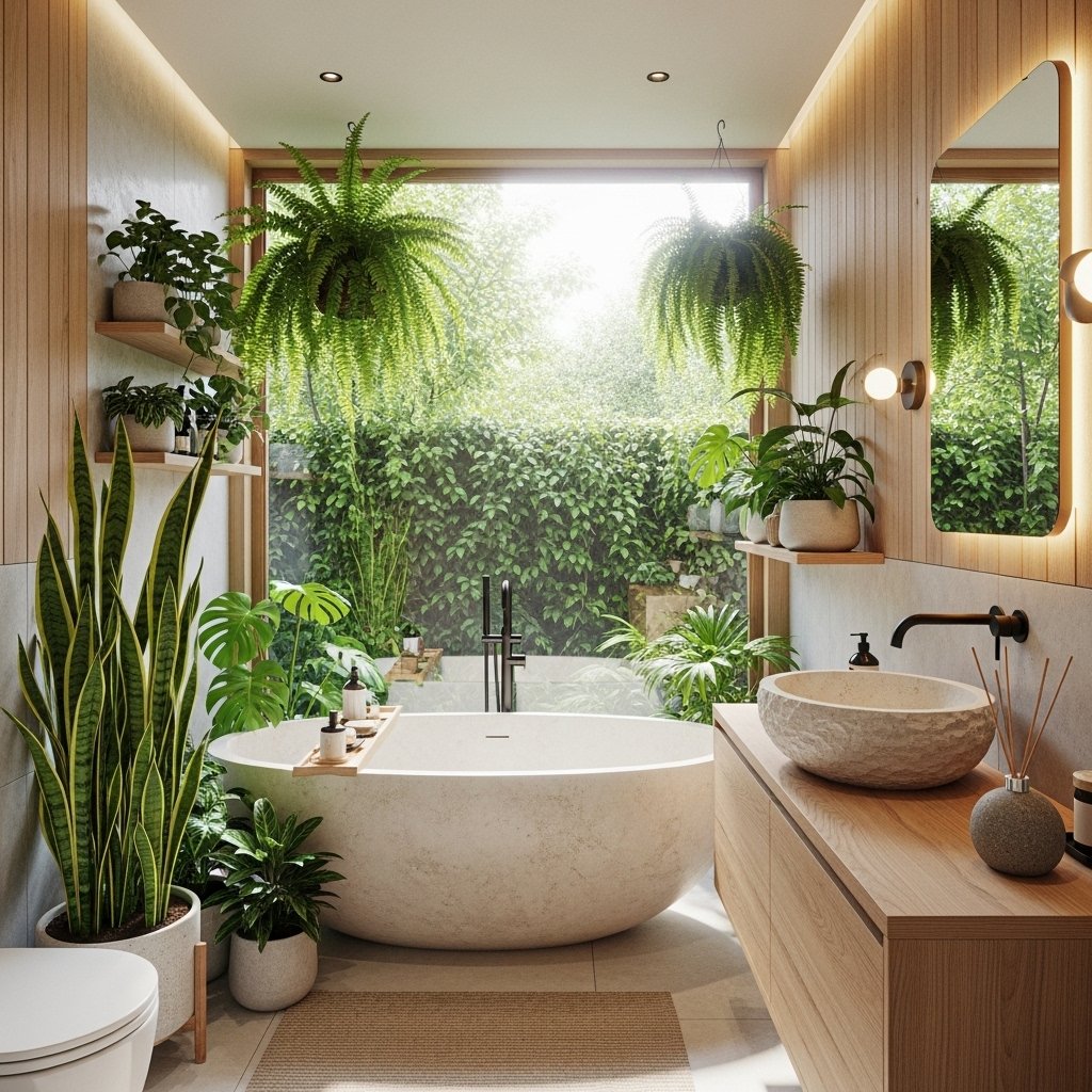 8. Nature-Inspired Bathroom with Bathtub and Greenery