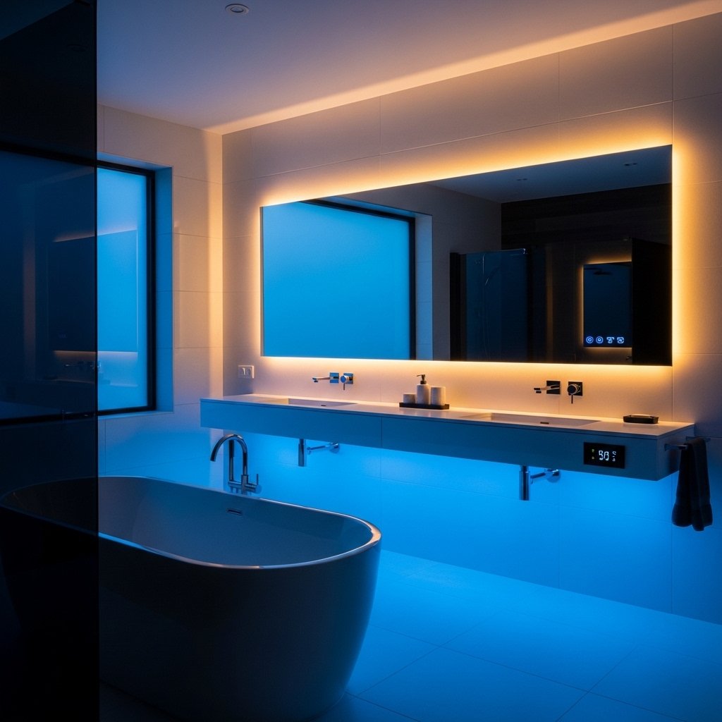 A bathroom interior with bathtub and LED lighting adds a modern and stylish touch. LED strips under the bathtub or behind mirrors create a glowing ambiance. Adjustable lighting allows you to change mood settings easily. This design is perfect for evening relaxation or spa-like experiences. It enhances both functionality and visual appeal.