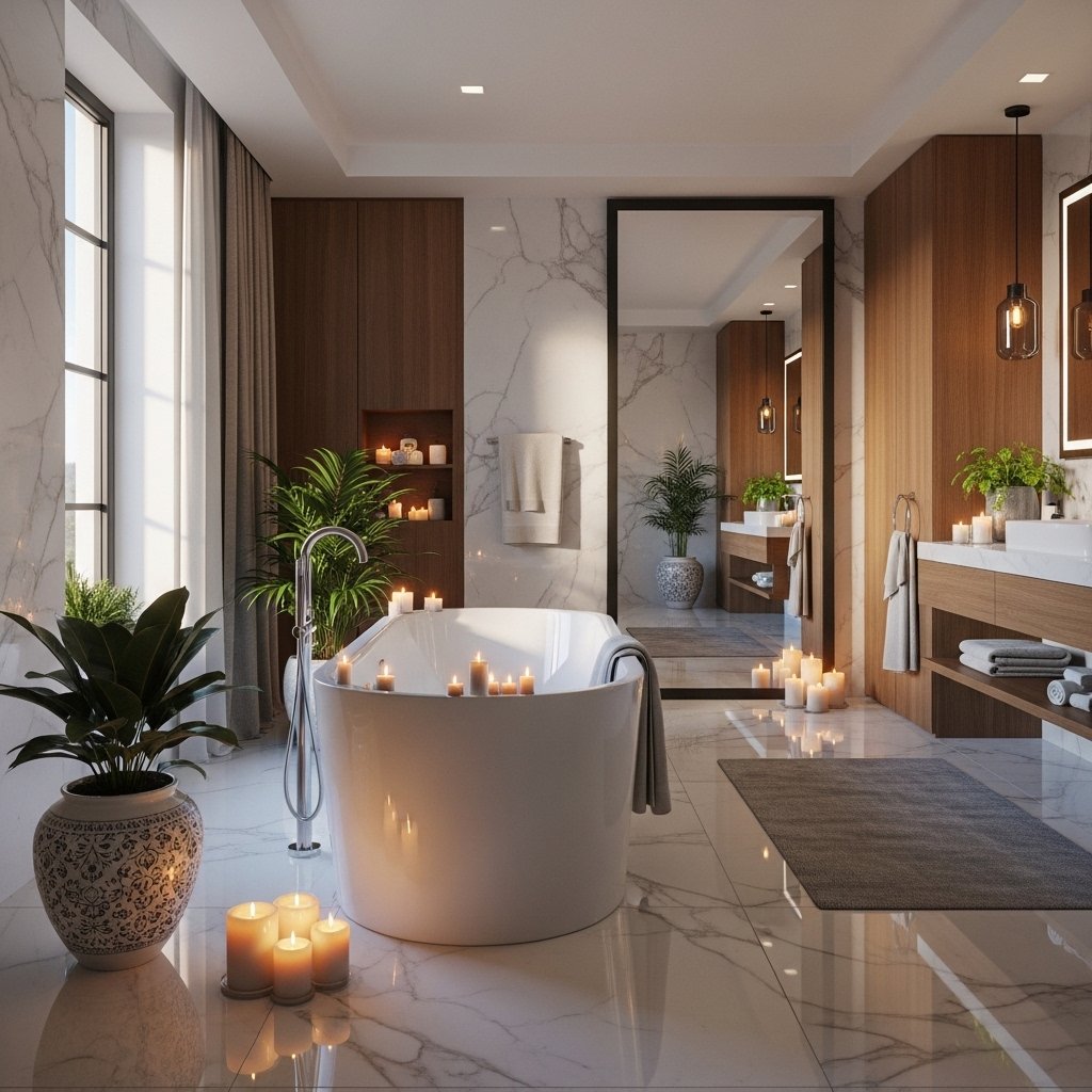 A spa-inspired bathroom interior with bathtub creates a relaxing and rejuvenating environment. Natural materials like stone, wood, and bamboo are often used to bring warmth and balance. Soft lighting, scented candles, and indoor plants add to the spa-like feel. A deep soaking bathtub enhances comfort and relaxation after a long day. This design transforms your bathroom into a personal wellness retreat.