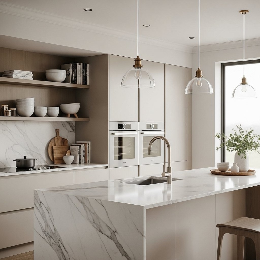 A modern kitchen is a key element of any beautiful home interior, combining functionality with sleek aesthetics. Clean cabinetry, organized storage, and high-quality finishes create a polished look. Neutral tones with accents of wood or metallic elements add warmth and style. Open shelving can be used to display decorative items or essentials in a visually appealing way. This design ensures your kitchen remains both practical and visually pleasing.
