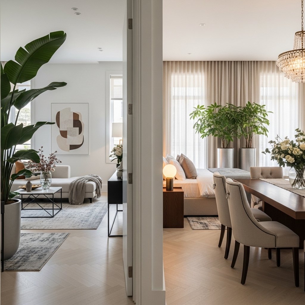 A minimalist living room is the foundation of a beautiful home interior, focusing on simplicity and clean lines. Neutral color palettes such as white, beige, and soft gray create a calm and open atmosphere. Furniture is kept functional with sleek designs and minimal clutter to maintain visual balance. Adding a few statement pieces like a modern sofa or artwork enhances the overall look without overwhelming the space. This design approach promotes relaxation while keeping your home stylish and organized.