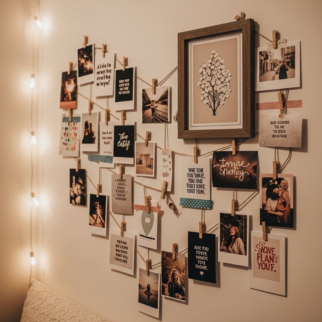 A DIY photo gallery wall is a meaningful way to decorate your bedroom with memories and creativity. You can print photos, quotes, or aesthetic images and arrange them in grids, clusters, or heart shapes. Using washi tape, clips, or handmade frames keeps the look casual and artistic. This type of décor allows easy updates whenever you want a fresh style. A photo wall adds personality and emotional warmth to your bedroom.