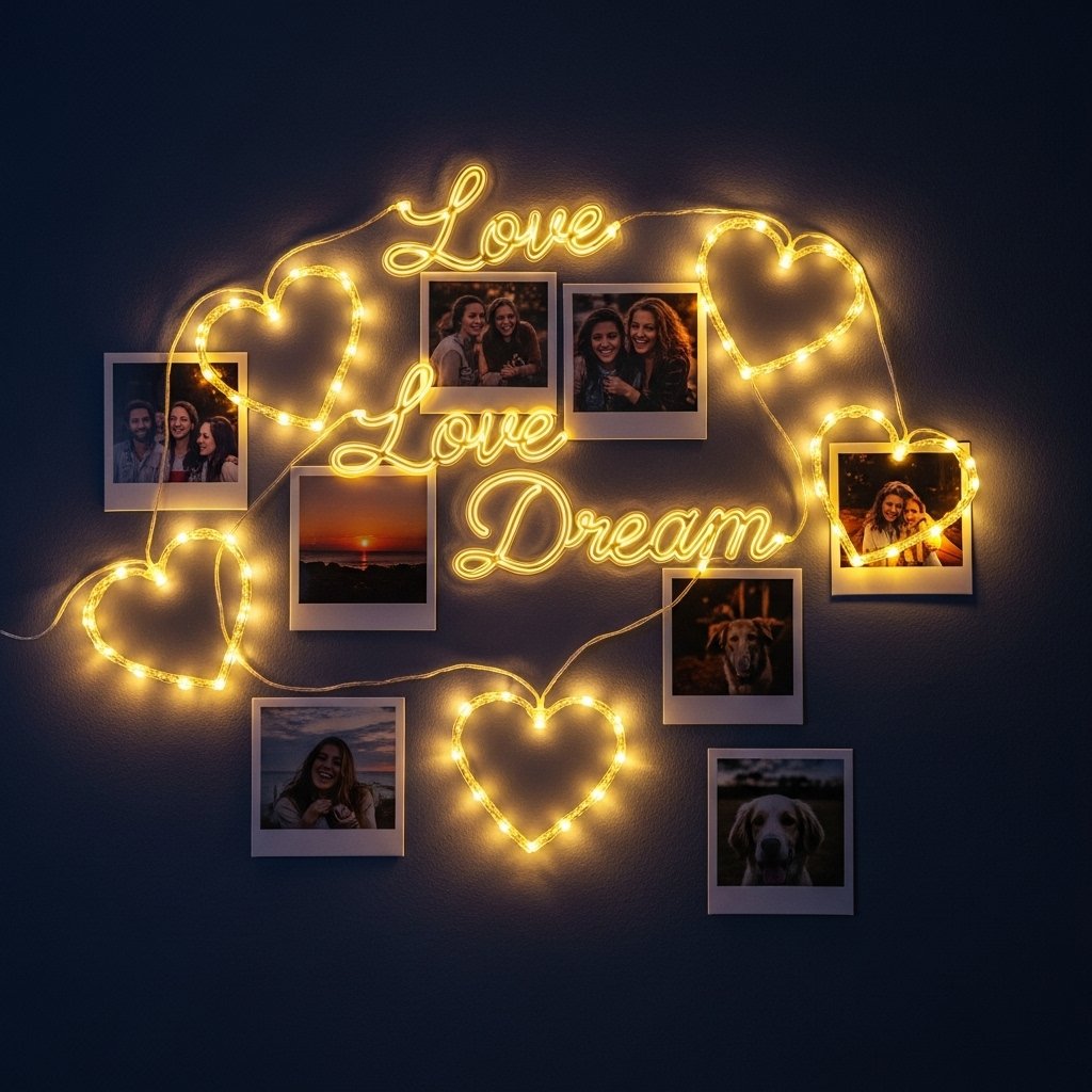 String lights can be transformed into creative décor with a little imagination. You can shape them into hearts, stars, words, or frames around photos on your wall. Warm white or soft yellow lights create a cozy and relaxing bedroom atmosphere. This DIY idea works especially well for accent walls or above the bed. It adds charm, softness, and a dreamy aesthetic to the room.