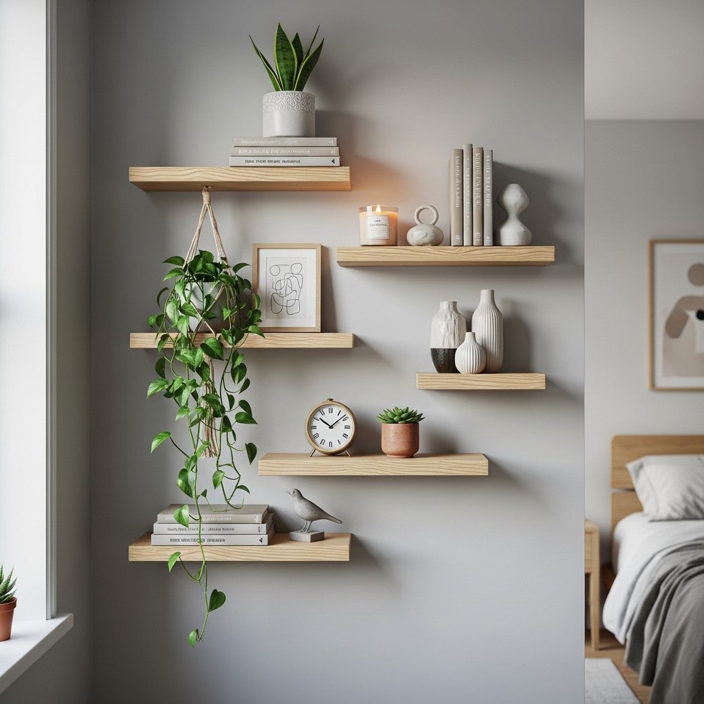 DIY floating shelves provide both decoration and storage in a creative way. You can build shelves using wood planks, brackets, or repurposed materials. These shelves are perfect for displaying plants, books, candles, and small decorative items. Keeping shelf décor minimal prevents the room from feeling cluttered. Floating shelves enhance wall space while maintaining a clean and stylish bedroom look.