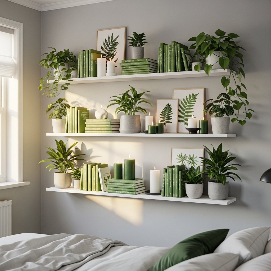 Wall shelves are a smart solution for small bedrooms with limited storage. Decorating shelves with green plants, books, candles, or small decor items adds personality without cluttering the room. Floating shelves keep the floor clear and make the room appear larger. Choosing wooden or white shelves complements green decor beautifully. This idea combines functionality with aesthetic appeal.
