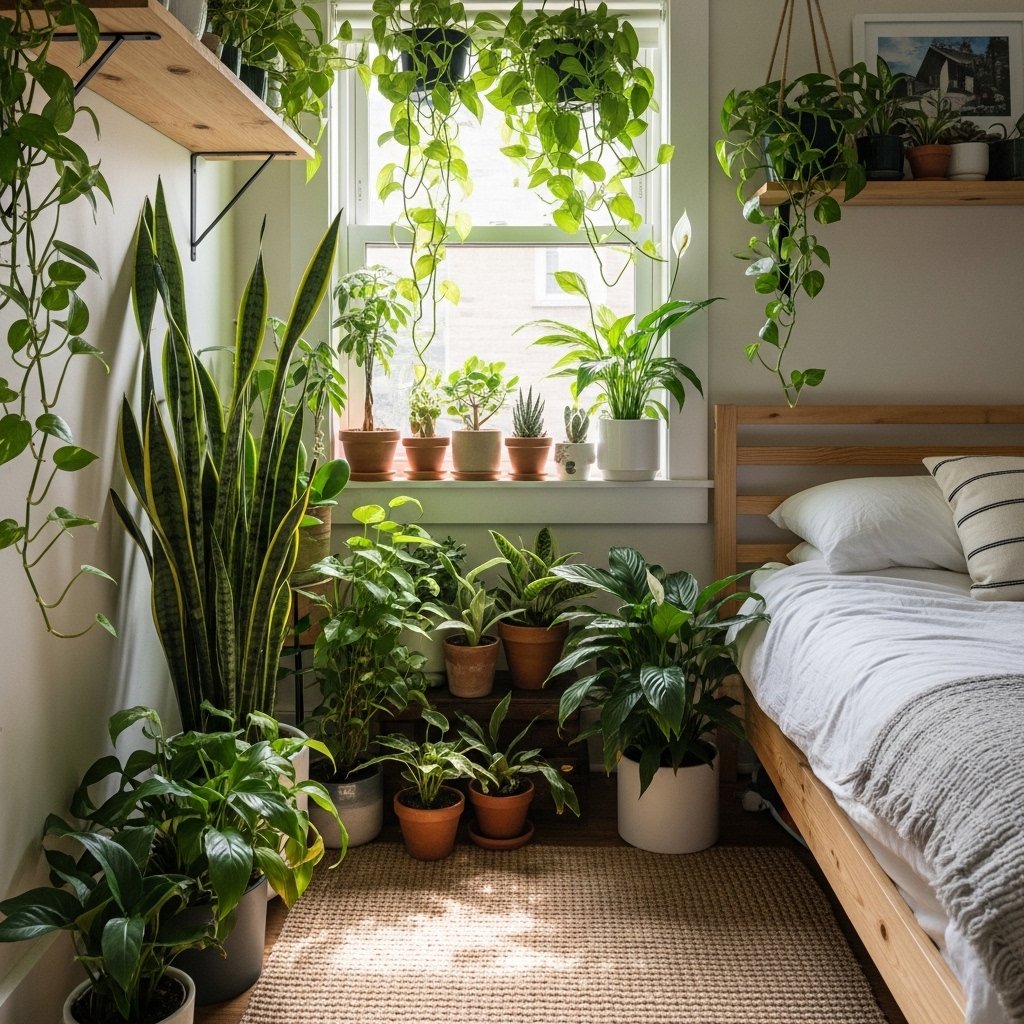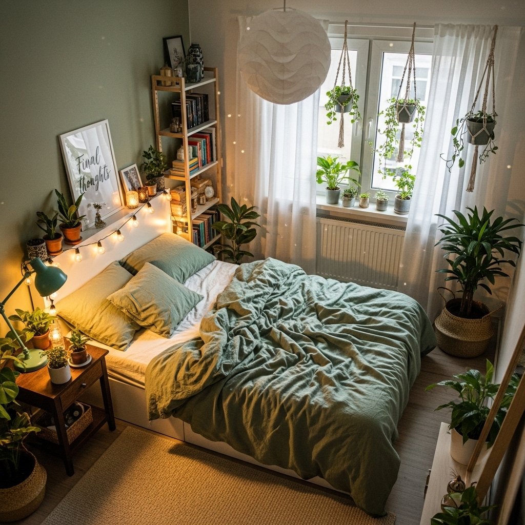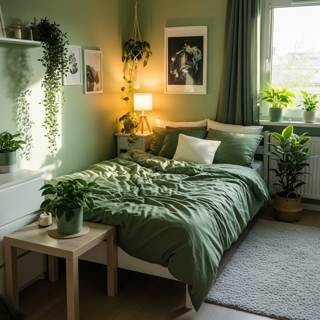 Indoor plants are essential for achieving a cozy green bedroom aesthetic. Small plants like succulents, pothos, or snake plants fit perfectly in compact spaces without taking up too much room. Placing plants on shelves, windowsills, or hanging planters keeps the floor space free. The greenery enhances the natural theme while improving air quality and mood. This idea creates a refreshing and peaceful environment that feels connected to nature.