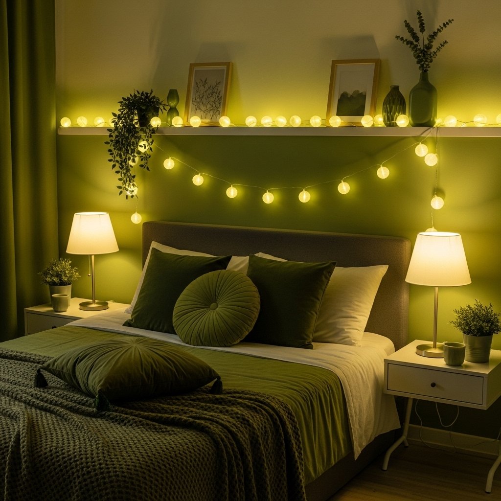 5. Cozy Lighting with Warm Green Decor
