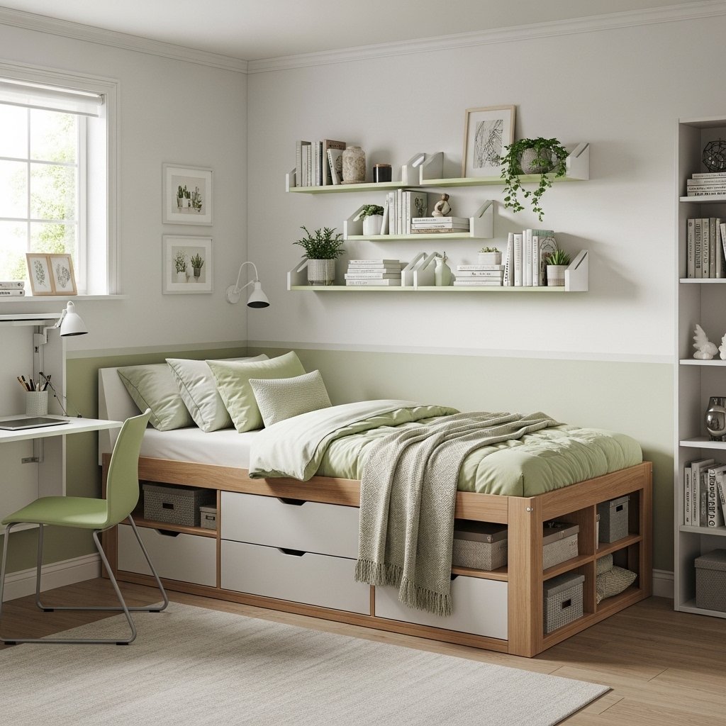 Multi-functional furniture is essential when designing a small bedroom. Beds with storage drawers, foldable desks, or wall-mounted shelves maximize space without cluttering the room. Choosing furniture in neutral or light green tones keeps the theme consistent. This approach ensures practicality while maintaining a stylish look. It’s perfect for women who want both comfort and functionality in limited space.