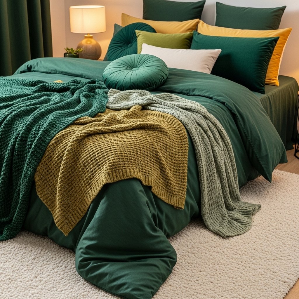Layering textures is key to making a small bedroom feel warm and cozy. Combining soft blankets, knitted throws, velvet cushions, and rugs in green tones adds richness to the space. Mixing textures prevents the room from looking flat or boring. Keeping the color palette consistent ensures harmony and balance. This idea creates a luxurious feel without requiring extra space.