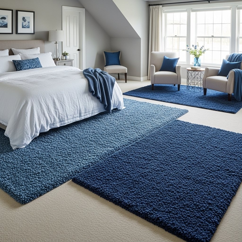 A blue rug can add both color and comfort to your bedroom. Light or medium blue rugs complement neutral floors while darker shades add contrast. Choose soft textures like wool, shag, or velvet for warmth underfoot. Rugs can define areas such as the bed, reading corner, or seating area. This simple addition enhances coziness and ties together the room’s color scheme.