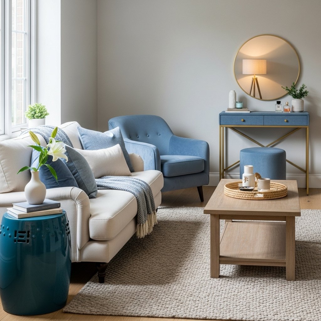 Small decorative pieces like vases, candles, trays, or clocks in blue can tie the room together. Choose metallic accents in gold, brass, or silver to complement the blue tones. Subtle décor adds personality without creating clutter. Accessories can also be swapped seasonally for an easy refresh. These small touches enhance the cozy and cohesive feeling of the space.