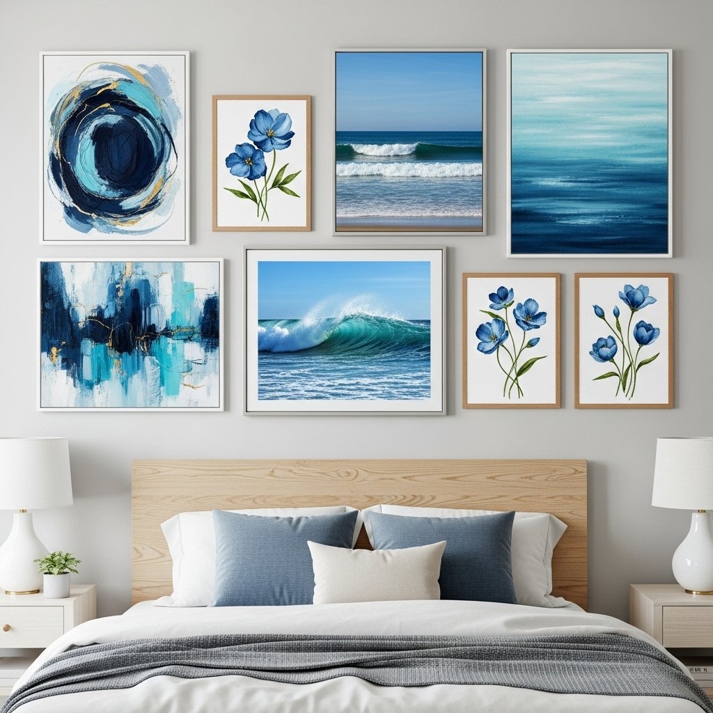 Wall art in shades of blue adds depth and creativity to the bedroom. You can choose abstract paintings, ocean landscapes, or floral prints to match your style. Framed art or canvas pieces enhance the focal points of the room. Pairing blue art with neutral walls and furniture keeps the space calm and cohesive. Art is a subtle yet impactful way to incorporate blue décor without overdoing it.