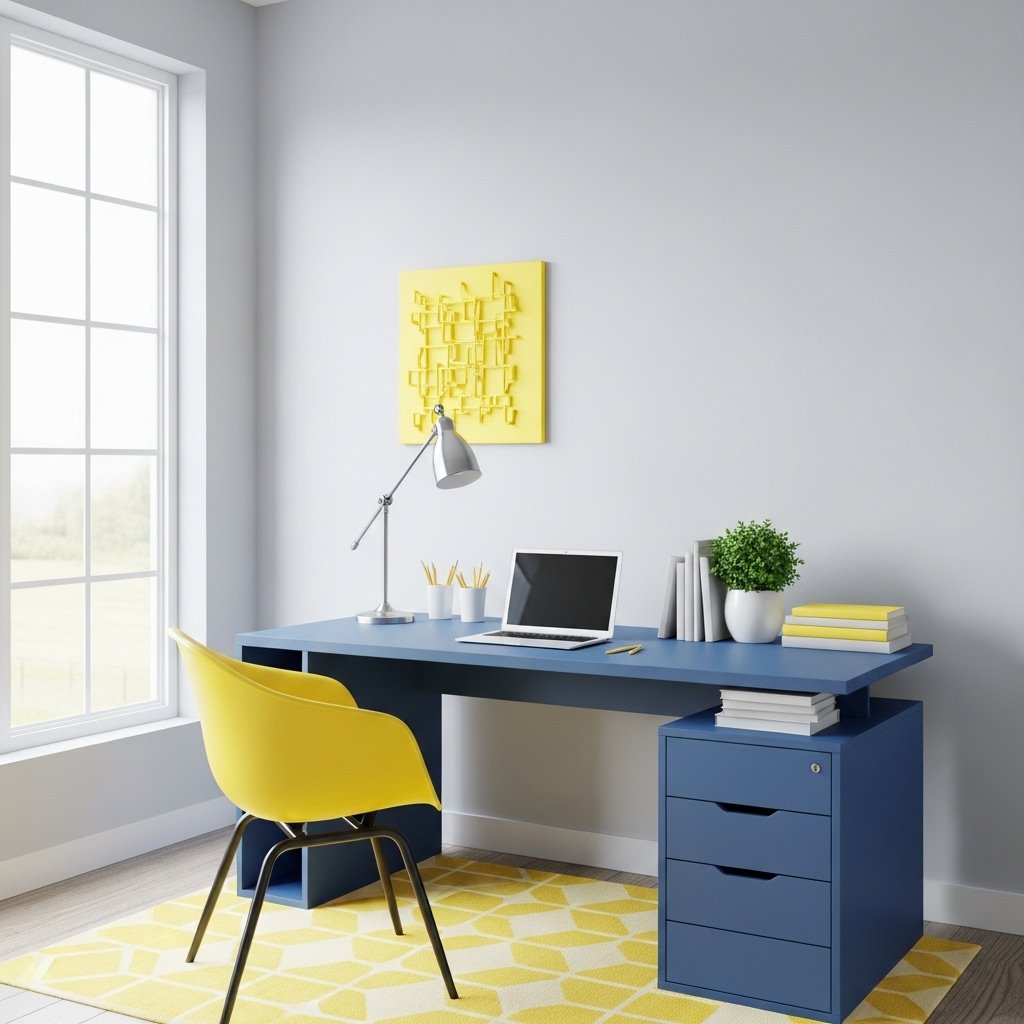 A home office with blue and yellow accents improves focus and creativity. Blue helps with concentration while yellow stimulates energy and ideas. A blue desk with yellow stationery or wall décor creates a productive environment. Proper lighting is essential to balance both colors effectively. This setup is ideal for remote work or study spaces.