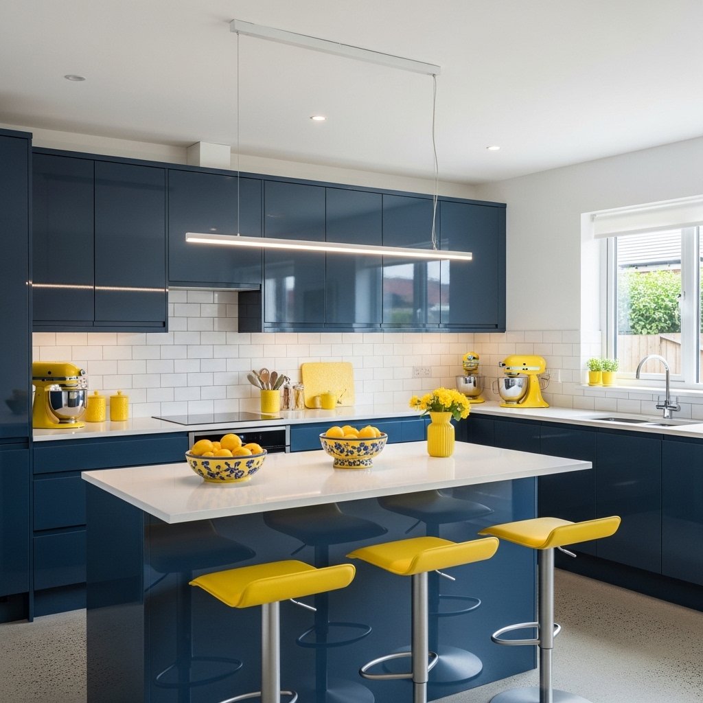 In a kitchen, blue cabinets combined with yellow handles, shelves, or backsplash accents create a unique and energetic vibe. This design works especially well with white countertops for balance. Light blue shades make the space feel airy, while darker tones add richness. Yellow lighting fixtures or bar stools can further enhance the theme. This interior idea is perfect for modern and creative kitchens.