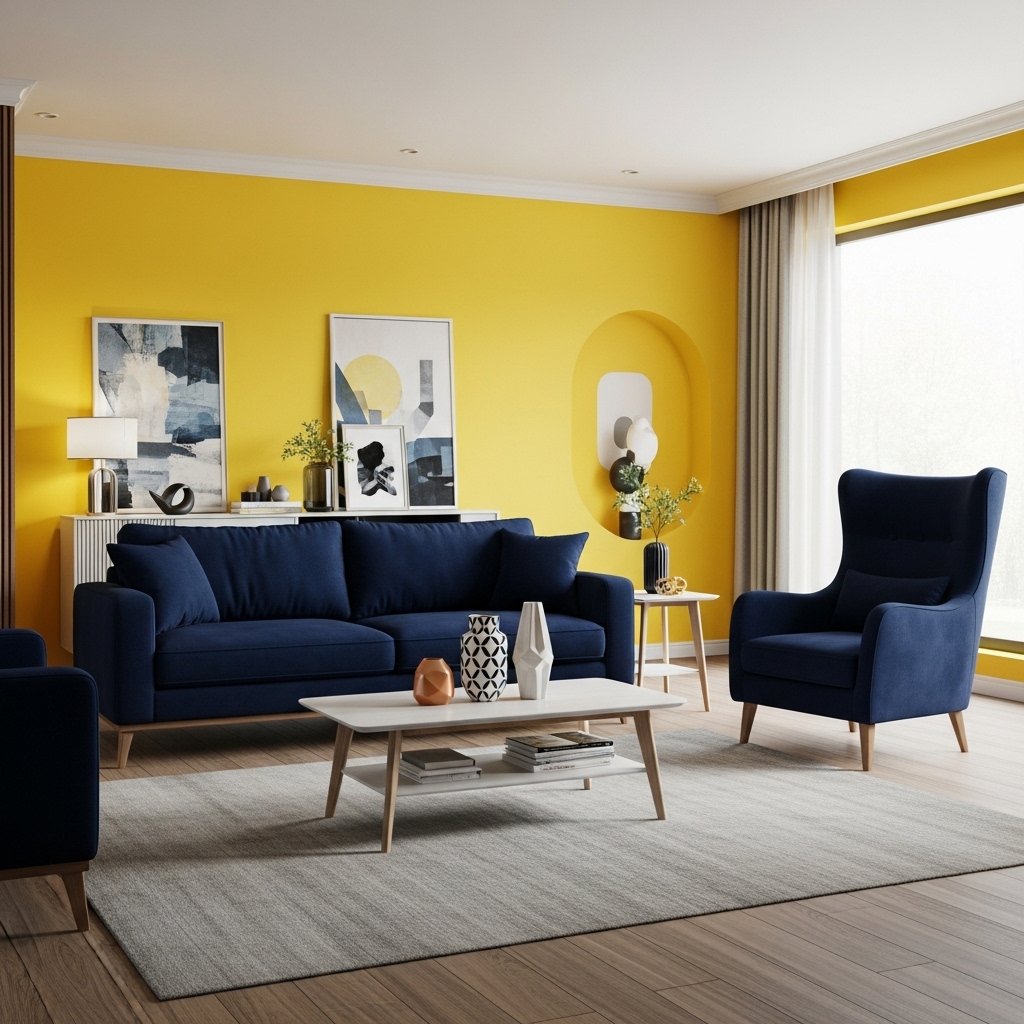 4. Yellow Walls with Blue Furniture Contrast