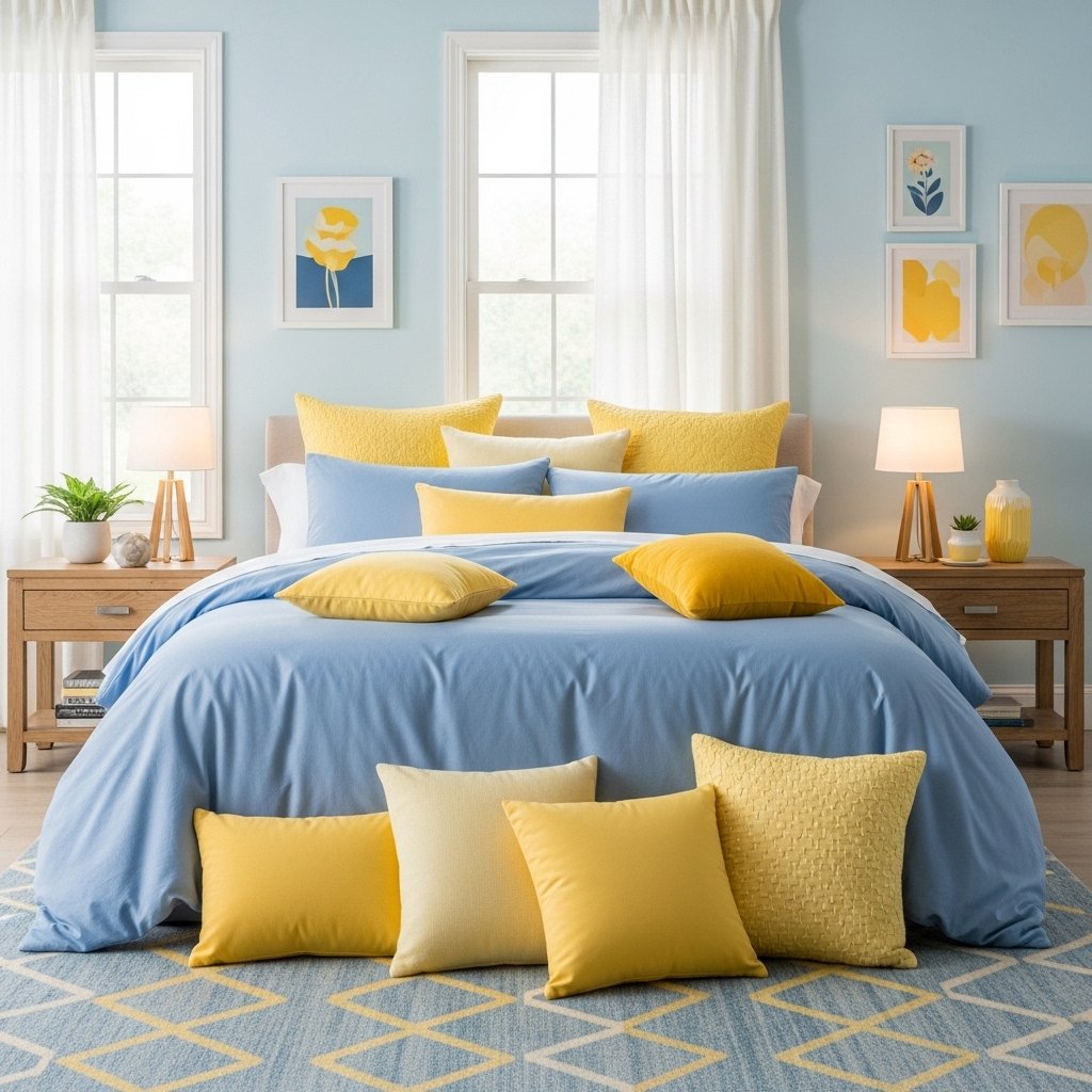 A bedroom with blue and yellow tones creates a balanced and calming yet cheerful environment. Soft blue bedding combined with yellow pillows gives a cozy and inviting feel. You can also use yellow bedside lamps to add warmth during nighttime. Light pastel shades of both colors work best for relaxation. This setup helps maintain both comfort and visual appeal in sleeping spaces.