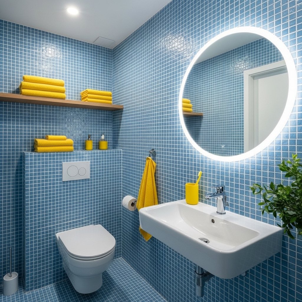 A blue and yellow bathroom design creates a fresh and clean atmosphere. Blue tiles or walls paired with yellow towels and accessories add a cheerful contrast. This combination works especially well in small bathrooms by making them feel brighter. White fixtures help maintain cleanliness and balance. It’s a simple way to upgrade your bathroom without major renovation.