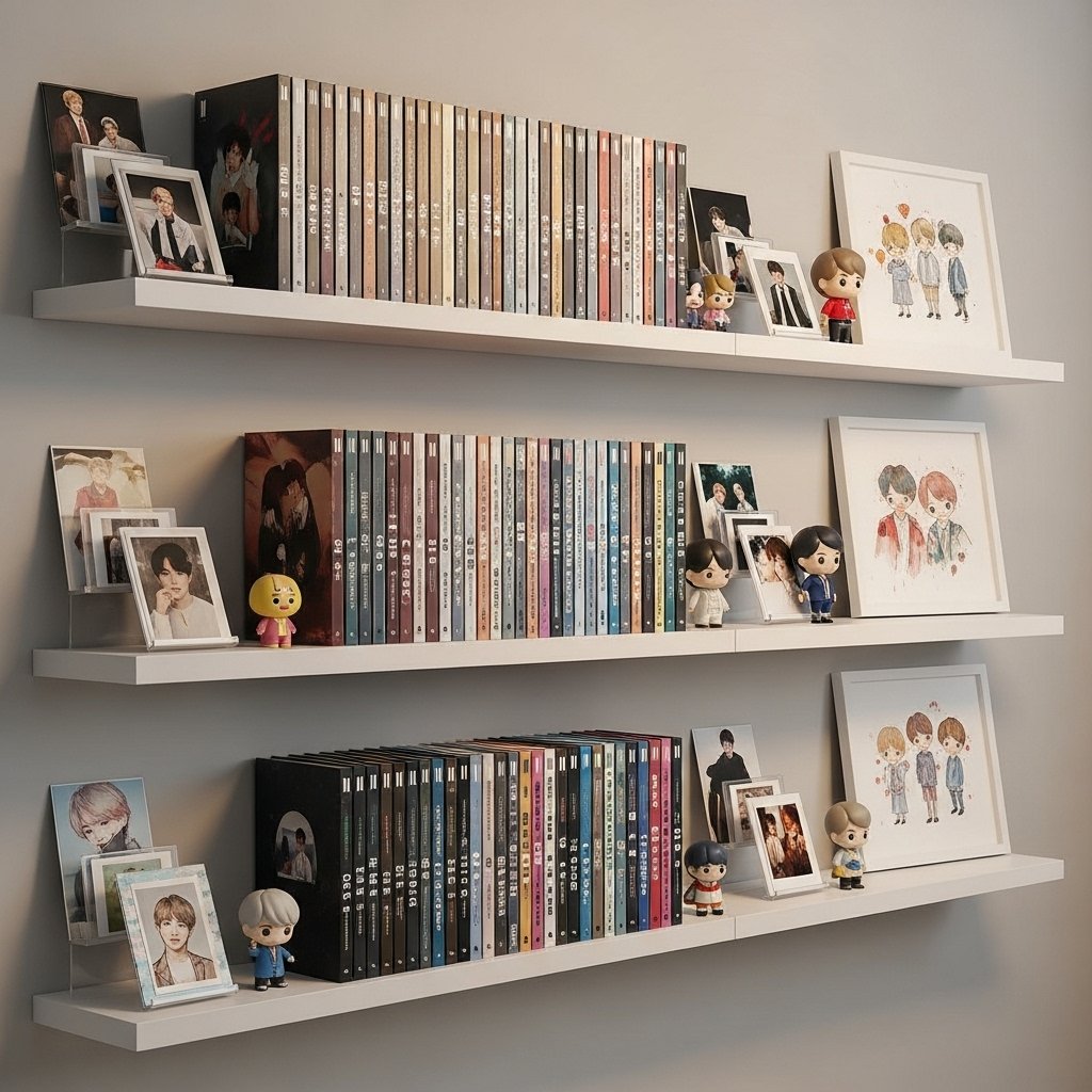 A BTS album display shelf is a great way to showcase your collection in a stylish way. Use floating shelves and arrange your BTS albums in a neat order. Add small BTS figurines, photo cards, or light decorations to complete the display. This idea not only looks aesthetic but also keeps your albums organized. It is perfect for fans who want a clean and trendy BTS room.