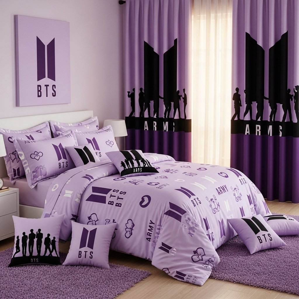 Changing your curtain and bedding to BTS theme can completely transform your room. Choose pastel or purple bedding that matches the BTS aesthetic vibe. You can also print BTS quotes or logos on plain curtains using fabric paint. Adding matching cushions and rugs will complete the look and make your room cozy. This decor idea is perfect for fans who want a full BTS room makeover.