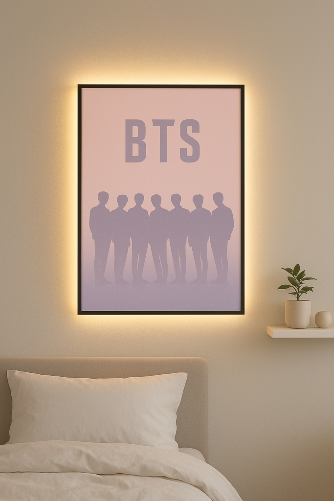 A BTS aesthetic wall poster can instantly upgrade the look of your room. Choose pastel-colored posters or minimalist BTS designs that match your room’s theme. You can frame the posters for a clean and stylish appearance or stick them directly on the wall for a casual vibe. Adding small LED strip lights behind the poster makes it stand out at night. This simple decor idea is perfect for fans who want a classy and trendy BTS room.