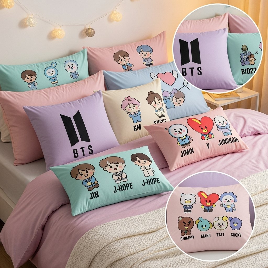 BTS theme pillow covers are a simple way to add BTS vibes to your room without making a big change. You can sew or print BTS designs on plain pillow covers using fabric paint or iron-on transfers. Choose pastel colors like lavender, pink, or sky blue for a soft aesthetic look. Add a few BTS-inspired pillows to your bed or couch to create a cute and comfy space. This DIY decor idea is perfect for fans who love minimal but stylish decorations.