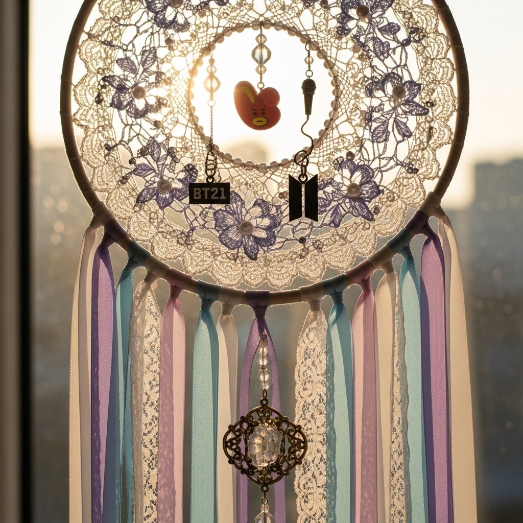 A BTS inspired dreamcatcher is a beautiful decor piece that adds an aesthetic touch to your room. Use lace, beads, and soft ribbons in pastel colors to create a dreamy look. Add small BTS charms or printed photos in the middle to personalize the dreamcatcher. Hang it near your window or above your bed for a magical vibe. This DIY idea is perfect for adding a delicate and cute touch to your BTS room.