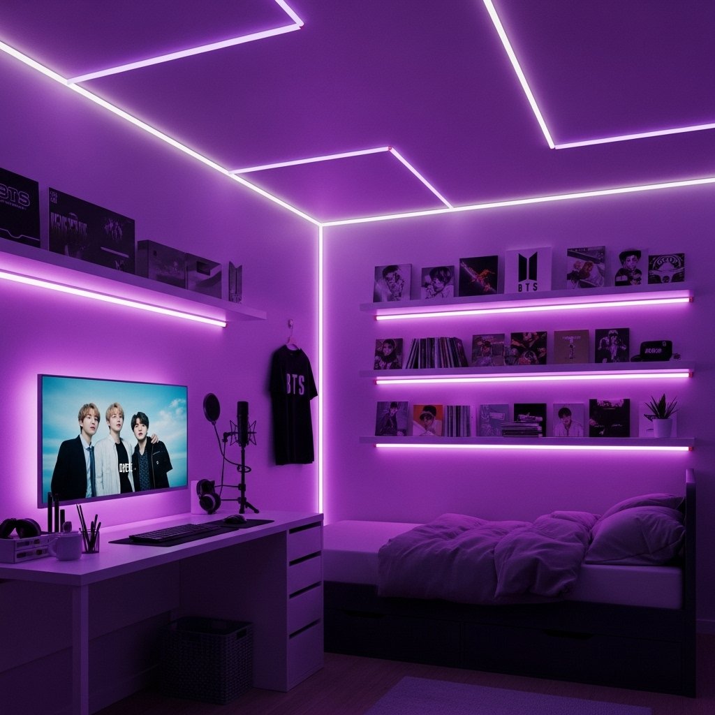 LED strip lights are essential for creating a BTS room aesthetic. You can attach LED strips around the bed frame, ceiling, or shelves to create a soft glow. Choose purple or pastel colors to match the BTS vibe and create a cozy atmosphere. You can also change the colors according to your mood or BTS music. This easy DIY idea instantly upgrades the room and makes it look like a K-pop studio.